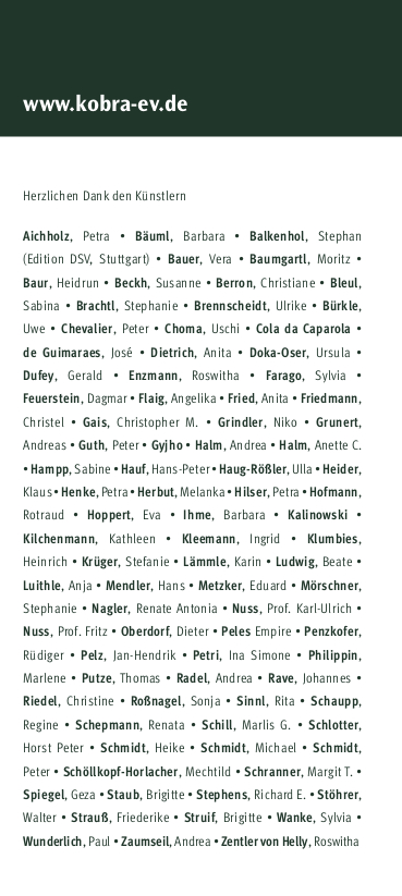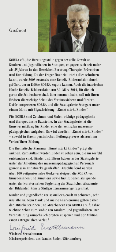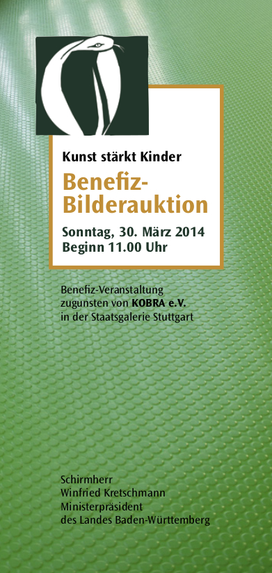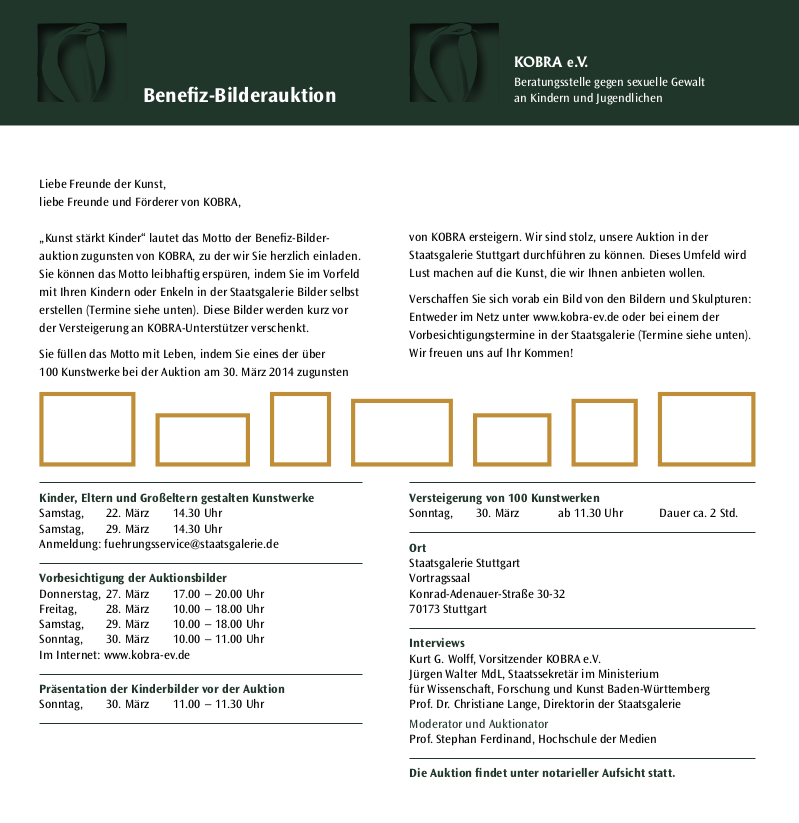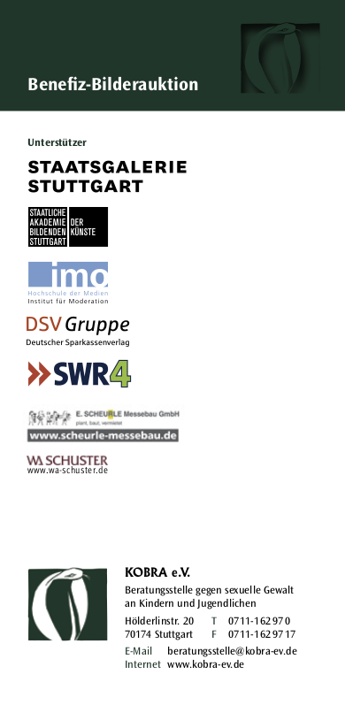 Sehr geehrte Damen und Herren, liebe Freunde und Förderer von KOBRA, wir freuen uns, Sie zu unserer dritten BENEFIZ-BILDERAUKTION am 28. Februar 2010 in die Staatliche Akademie der Bildenden Künste Stuttgart einladen zu dürfen. Zahlreiche Künstler haben Bilder gestiftet, um mit deren Versteigerungserlös die Aufgaben und Ziele von KOBRA tatkräftig zu unterstützen. Nach der offiziellen Eröffnung und Begrüßung wird der Auktionator mit der Versteigerung der ca. 100 Exponate beginnen. Machen Sie sich ein Bild und wählen Sie schon im Vorfeld Ihr Wunschobjekt aus. Wir freuen uns über Ihre Teilnahme!