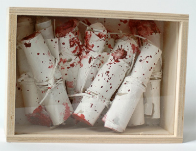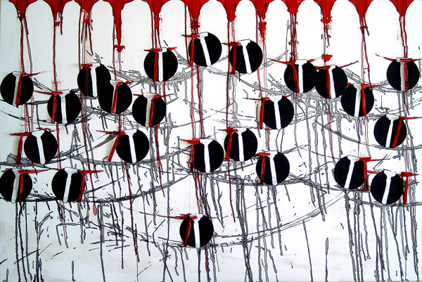 Mixed Media, Acryl, Papier, Holzkugeln / Leinwand